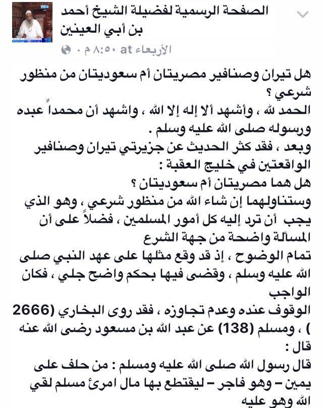تطرقت الصفحة الرسمية لفضيلة الشيخ أحمد بن أبي العينين إلى قضية تنازل السيسي عن جزيرتي تيران وصنافير لصالح السعودية مقابل حفنة من المساعدات مؤكدة تبعيتهما لمصر.