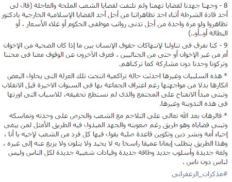 وذكر الزعفراني عبر حسابه بموقع التواصل الاجتماعي فيس بوك أسباب عزلة جماعة الإخوان المسلمين في 9 نقاط كالتالي: