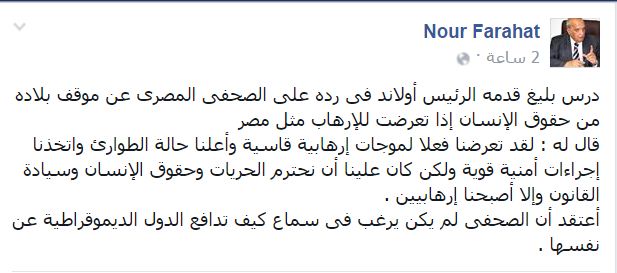 وقال -عبر منشور له على “فيس بوك”-: “درس بليغ قدمه الرئيس هولاند في رده على الصحفي المصري عن موقف بلاده من حقوق الإنسان إذا تعرضت للإرهاب مثل مصر”.