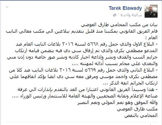 تقدم المحامي طارق العوضي، ببلاغين إلى النائب العام، ضد كلٍ من النائب مصطفى بكري، والإعلامي أحمد موسى؛ لارتكابهما جرائم سب وقذف وتعدٍ على محامٍ بسبب أدائه لمهنته.