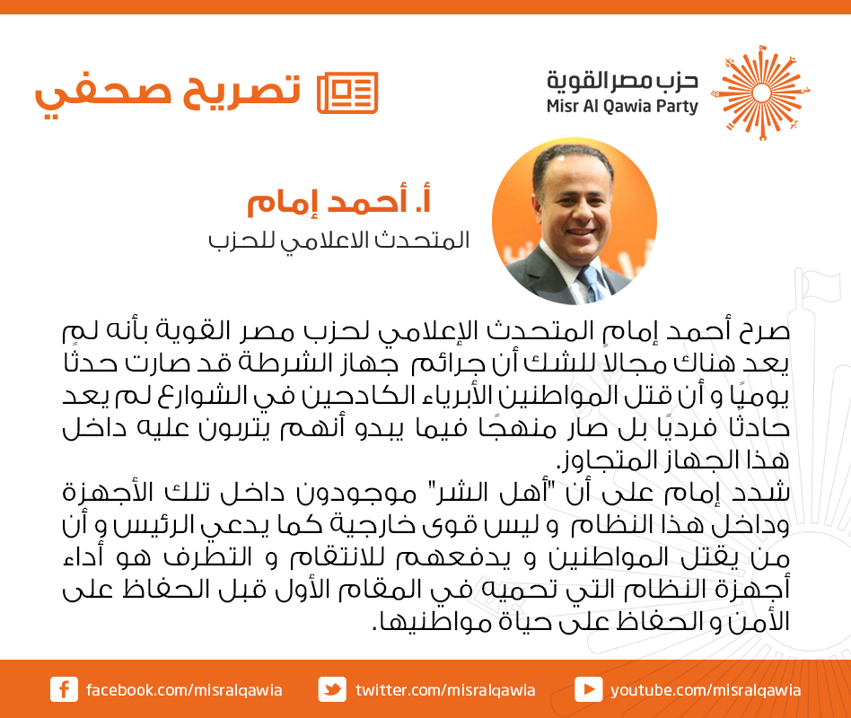 أكد أحمد إمام، المتحدث الإعلامي باسم حزب مصر القوية، أن جرائم جهاز الشرطة صارت حدثًا يوميًا، وأن قتل المواطنين الأبرياء الكادحين في الشوارع لم يعد حادثًا فرديًا بل صار منهجًا في ما يبدو أنهم يتربون عليه داخل هذا الجهاز