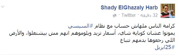 وقال -عبر منشور له على “فيس بوك”-: “كرامة الناس ملهاش حساب مع نظام السيسي، يموتوا عشان كوباية شاي”.