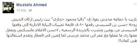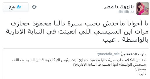 أثار تعيين داليا محمود إبراهيم محمود حجازي، ابنة رئيس أركان القوات المسلحة، وزوجة حسن نجل عبدالفتاح السيسي، في النيابة الإدارية، استياء العديد من رواد مواقع التواصل الاجتماعي “فيس بوك” و”تويتر”.