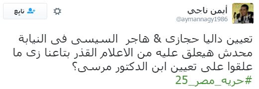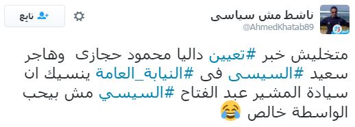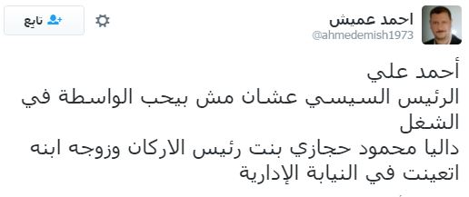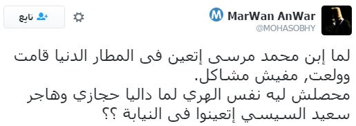 وقال النشطاء ساخرين، إن الأمر يجب أن يظل طي الكتمان، حتى لا يحدث كما فعل نجل مرسى وتقدم باستقالته من المطار بعد أن تداول خبر تعيينه بأن والده هو السبب فيه، وعلّق آخر قائلًا: “البلد بلدهم والدفاتر دفاترهم”.
