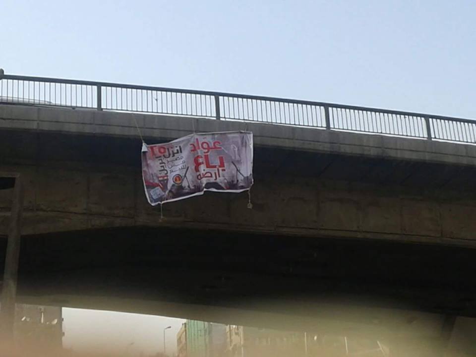 علق عدد من الشباب بعض اللافتات علي كوبرى أحمد عرابي بالمهندسين وكوبرى جامعة الدول بشارع شهاب، حملت عبارة: “عواد باع أرضه”، إشارة إلى تنازل السيسي عن “تيران وصنافير” للسعودية.