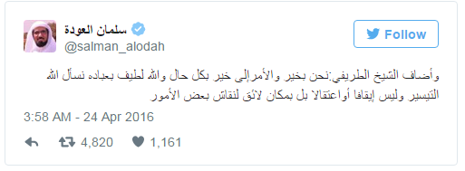 وقال العودة، في تغريدة على حسابه على موقع التواصل الاجتماعي “تويتر”: “إن الطريفي أبلغه أنه “بخير، والأمر إلى خير بكل حال، والله لطيف بعباده”، مؤكدا أن ما جرى “ليس إيقافا أو اعتقالا”، وأنه “بمكان لائق لنقاش بعض الأمور”.