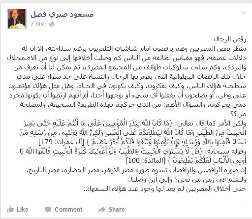 قال مسعود صبري فضل، الكاتب والباحث بقسم الشريعة بكلية دار العلوم، إن "منظر بعض المصريين وهم يرقصون أمام شاشات التليفزيون برغم سذاجته، إلا أن له دلالات عميقة؛ فهو مقياس لطائفة من الناس كم وصلت أخلاقها إلى نوع من الاضمحلال".