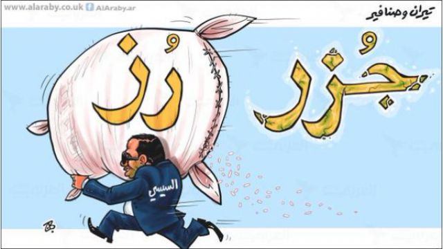 وقدم نفس الموقع رسمًا ساخرًا من رفع مؤيدي السيسي الأعلام السعودية في احتفالات عيد تحرير سيناء: