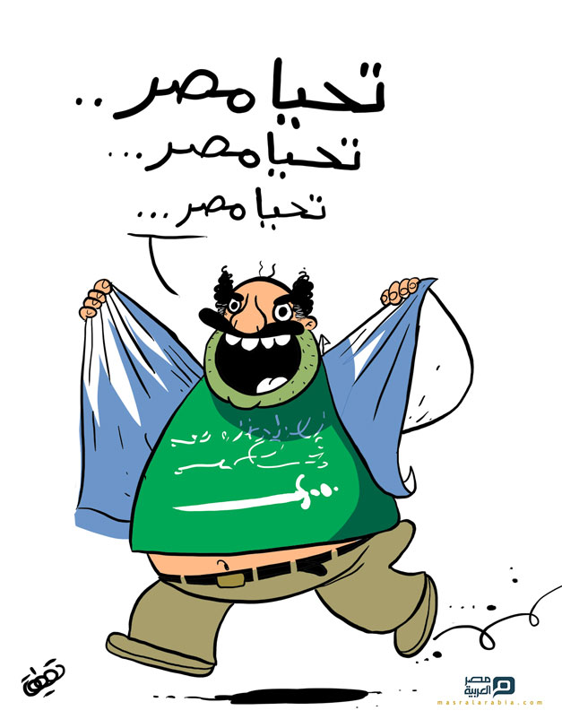 ورسم “لاتوف” مؤيد للنظام يرفع الأعلام السعودية يحتمي برجل أمن يطلق رصاصاته علي شاب مصري يرفع العلم المصري ويطالب باستعادة أراضي بلده.