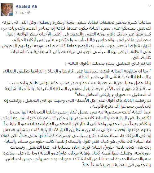 وكتب خالد علي قبل التحقيق الثاني مع سناء وصدور قرار إخلاء سبيلها الثاني على حسابه بموقع التواصل الاجتماعي “فيس بوك”: