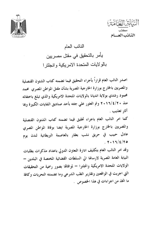 وكشف بيان صادر عن مكتب النائب العام عن إجراء التحقيق فيما تضمنه كتاب الشؤون القنصلية والمصريين بالخارج بوزارة الخارجية المصرية بشأن مقتل المواطن المصري محمد محمود رشدي بولاية إنديانا بالولايات المتحدة الأميركية والذي تبلغ باختفائه منذ 20 إبريل 2016، وتم العثور على جثته بأحد صناديق النقابات الكبيرة وبها آثار تعذيب.