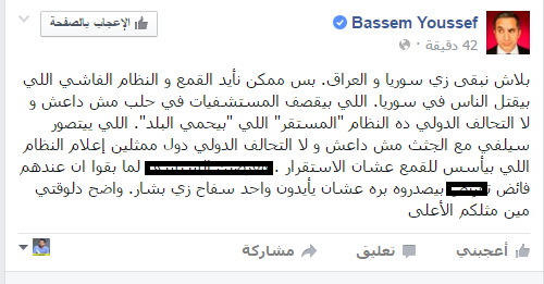 وأضاف باسم يوسف -في تدوينة له على حسابه الرسمي على موقع التواصل الاجتماعي فيس بوك-: “بلاش نبقى زي سوريا والعراق، بس ممكن نأيد القمع والنظام الفاشي اللي بيقتل الناس في سوريا، اللي بيقصف المستشفيات في حلب مش داعش و لا التحالف الدولي ده النظام “المستقر” اللي “بيحمي البلد”، اللي ييتصور سيلفي مع الجثث مش داعش ولا التحالف الدولي دول ممثلين إعلام النظام اللي بيأسس للقمع عشان الاستقرار”.