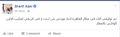 وقال شريف عازر، إنه تم توقيفه في مطار القاهرة، أمس الجمعة، أثناء عودته من لندن، وإنه في طريقه لمكتب الأمن الوطني بالمطار.