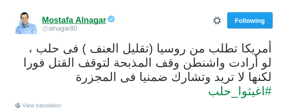 وقال -عبر تغريدة له على “تويتر”-: “أميركا تطلب من روسيا (تقليل العنف) في حلب، لو أرادت واشنطن وقف المذبحة لتوقف القتل فورًا، لكنها لا تريد وتشارك ضمنيًا في المجزرة”.