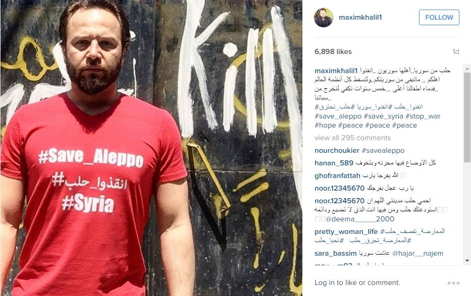 أعلن الممثل السوري مكسيم خليل تضامنه مع ضحايا حلب، من خلال نشر صورته على موقع التواصل الاجتماعي "إنستجرام"، مرتديا قميص أحمر اللون طبع عليه هاشتاج "أنقذوا حلب"