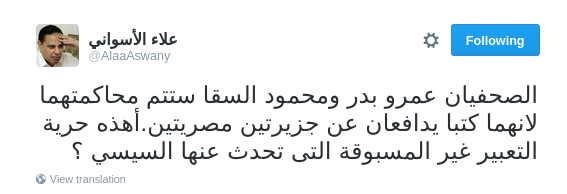 وقال -عبر تغريدة له على “تويتر”-: “الصحفيان عمرو بدر ومحمود السقا ستتم محاكمتهما لأنهما كتبا يدافعان عن جزيرتين مصريتين، أهذه حرية التعبير غير المسبوقة التي تحدث عنها السيسي؟“.