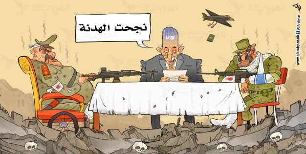 ونشر موقع “العربي الجديد” رسمًا وضح إعلان الأمم المتحدة لنجاح الهدنة على أشلاء وجثث وأرواح المدنيين.