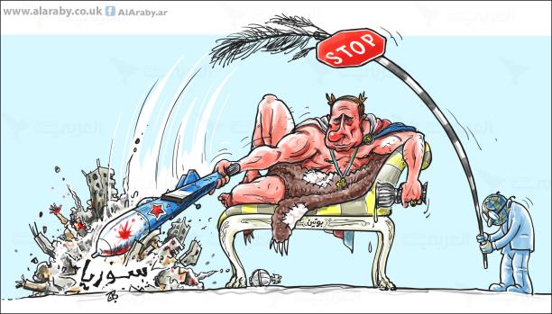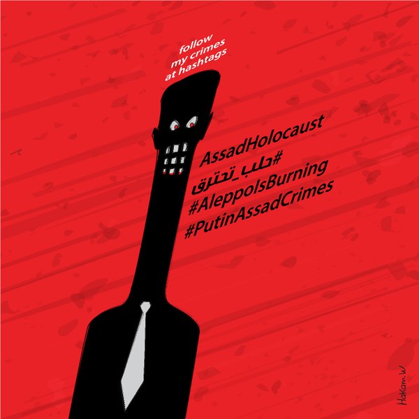عبر رسام الكاريكاتير العالمي “لاتوف”، عن جرم الأسد؛ حيث رسم قبضته وهي تدك حلب وتتقاطر من تحتها الدماء.