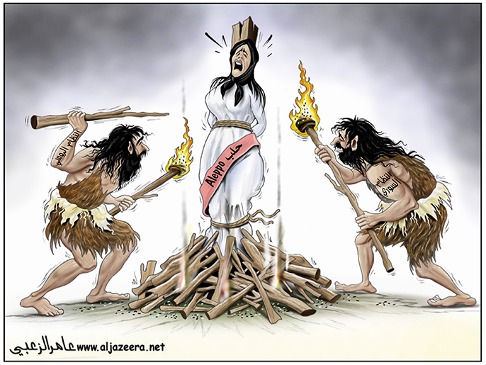 ما زالت مجازر حلب تحتل اهتمام كبريات الصحف المحلية والأجنبية والعربية؛ حيث جاءت الرسوم الكاريكاتورية الساخرة لتعبر عن مأساة أهالي حلب، في ظل الصمت الدولي.
