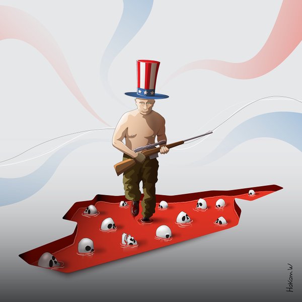 ونشر الرسام  “حكم الواهب” بوتين وهو يعبر بركة من الدماء على جماجم الضحايا.