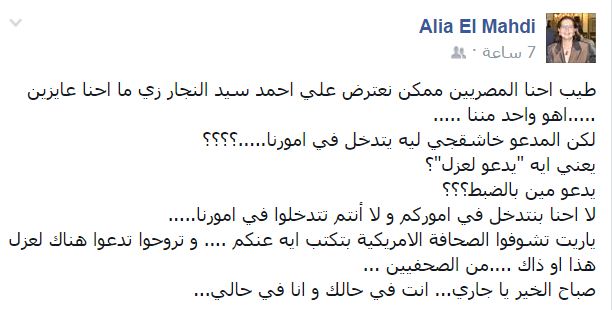 وقال -عبر منشور لها على “فيسبوك”-: “طيب احنا المصريين ممكن نعترض على أحمد سيد النجار زي ما احنا عايزين.. أهو واحد مننا، لكن المدعو خاشقجي ليه يتدخل في أمورنا؟”.