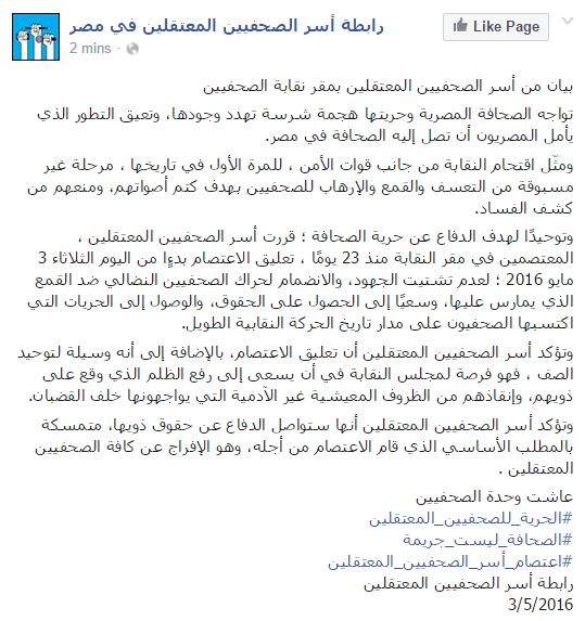 وأضاف البيان أن تعليق الاعتصام “فرصة لمجلس النقابة في أن يسعى إلى رفع الظلم الذي وقع على ذويهم، وإنقاذهم من الظروف المعيشية غير الآدمية التي يواجهونها خلف القضبان”.