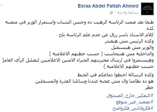 رأت الناشطة السياسية إسراء عبدالفتاح أن صمت عبدالفتاح السيسي عما حدث بنقابة الصحفيين من اقتحام على يد قوات الأمن هو رسالة للجميع (اخبطوا دماغكم في الحيط وده نظامنا)، بحسب قولها.