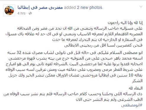 وقالت الصفحة إن الشاب يدعى محمد باهر صبحي “32 عامًا”، من محافظة المنوفية، ويعمل في نابولي بإيطاليا منذ عشر سنوات.