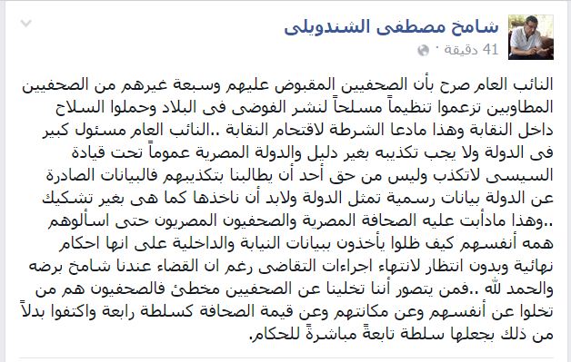 وأضاف -عبر منشور له على “فيس بوك”- أن الصحافة المصرية دأبت على نشر بيانات الدولة على أنها حقائق دون تشكيك، كبيان النائب العام الذي قال إن المعتقلين الصحفيين تنظيم مسلح.