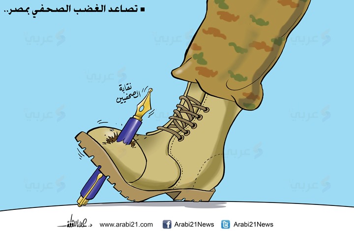 وجاء كاريكاتير موقع “عربي 21” مصورًا حراك نقابة الصحفيين في مقاومة البطش الأمني بحريات الرأي والتعبير: