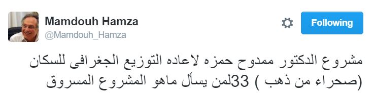 وأضاف: “مشروع الدكتور ممدوح حمزة لإعادة التوزيع الجغرافي للسكان (صحراء من ذهب ) 33 لمن يسأل ماهو المشروع المسروق”.