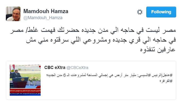 وقال حمزة في تغريدة عبر حسابه الشخصي بموقع التدوين المصغر “تويتر”: “مصر ليست في حاجه إلى مدن جديده حضرتك فهمت غلط مصر في حاجة إلى قرى جديدة ومشروعي اللي سرقتوه مني مش عارفين تنفذوه”.