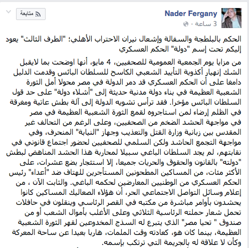 واختتم :”الأهم والأخطر هو أن الشعارات التي رفعها مستأجريه لتمثيل التأييد الشعبي الجارف لجرائم حكمه كانت كلها تحض على الاحتراب الأهلي، حيث كان هتاف “إذبح ياسيسي”، فاضحا أنه القاتل الذي لا يتورع عن الجريمة النكراء، وحمل بعض المستأجرين لافتات تسفر عداء مناطق معينة من خارج القاهرة للصحفيين، وكأن هناك عداء بين عامة الشعب والنخب التي تعد ضمير الشعب.