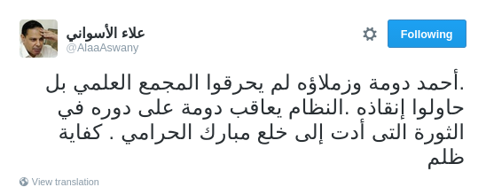 وقال في تغريدة عبر حسابه على موقع التدوين المصغر “تويتر”: ““أحمد دومة وزملاؤه لم يحرقوا المجمع العلمي بل حاولوا إنقاذه، النظام يعاقب دومة على دوره في الثورة التي أدت إلى خلع مبارك الحرامي، كفاية ظلم”.