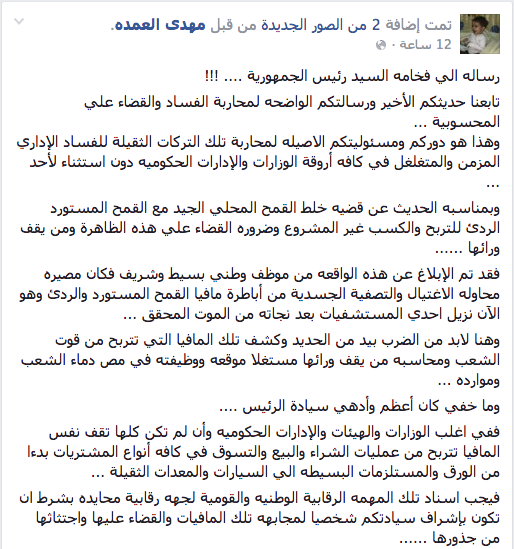 وقال – في رسالة للسيسي: تابعنا حديثكم الأخير ورسالتكم الواضحة لمحاربة الفساد والقضاء على المحسوبية ،وأود أن أذكر قضية خلط القمح المحلي الجيد مع القمح المستورد الردئ، للتربح والكسب غير المشروع وضروره القضاء على هذه الظاهرة ومن يقف ورائها، فقد تم الإبلاغ عن هذه الواقعة من موظف وطني بسيط وشريف فكان مصيره محاولة الاغتيال والتصفية الجسدية من أباطرة مافيا القمح المستورد والردئ، وهو الآن نزيل إحدى المستشفيات بعد نجاته من الموت المحقق.