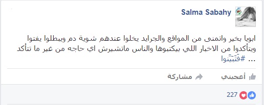 وقالت “سلمى“، اليوم الجمعة، عبر حسابها على موقع التواصل الاجتماعي “فيسبوك”: “أبويا بخير وأتمنى من المواقع والجرايد يخلوا عندهم شوية دم ويبطلوا يفتوا، ويتأكدوا من الأخبار اللي بيكتبوها، والناس ماتشيرش أي حاجة من غير ما تتأكد”.
