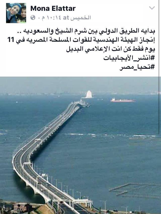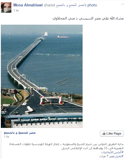 وروج مؤيدو السيسي مؤخرا صور لكوبري ونفق في اليابان إسمه “Tokyo Bay Aqua-Line” وتم تنفيذه منذ 9 سنوات، وقالوا أنه الطريق الدولي الذي سيربط بين شرم الشيخ والسعودية.