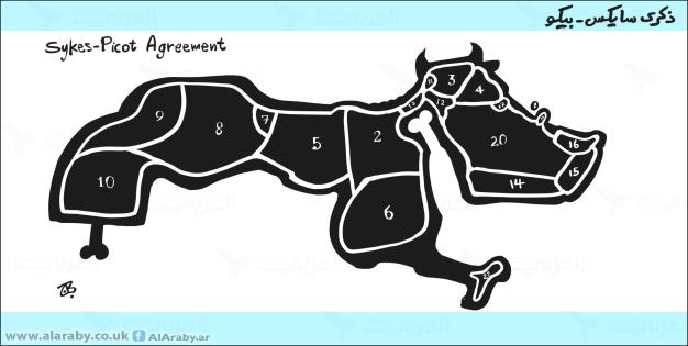 نشر موقع “العربي الجديد” رسمًا يظهر الوطن العربي بوليمة دسمة مقسمة في ذكرى اتفاقية سايكس بيكو.