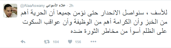 وقال الأسواني عبر حسابه على موقع التواصل الاجتماعي تويتر، مساء الأربعاء، “للأسف سنواصل الانحدار حتى نؤمن جميعًا أن الحرية أهم من الخبز، وأن الكرامة أهم من الوظيفة، وأن عواقب السكوت على الظلم أسوأ من مخاطر الثورة ضده”.