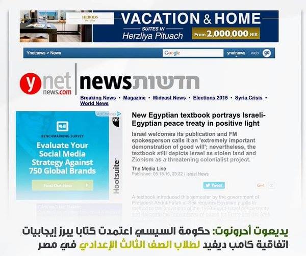 كشفت صحيفة يديعوت أحرونوت الإسرائيلية عن كتاب اعتمدته حكومة عبدالفتاح السيسي لطلاب الصف التاسع "الثالث الإعدادي"، يبرز إيجابيات اتفاقية كامب دافيد للسلام مع الاحتلال الإسرائيلي، والتي تم توقيعها عام 1978، وأهدرت فيها مصر