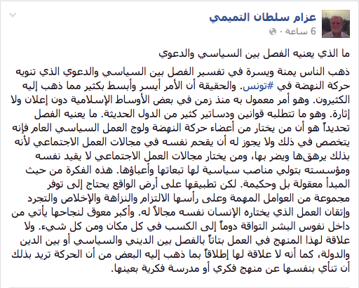 وقال “التميمي”، خلال منشور له عبر صفحته الشخصية على موقع التواصل الاجتماعي “فيس بوك”، ما يعنيه الفصل تحديدًا هو أن من يختار من أعضاء “حركة النهضة” ولوج العمل السياسي العام فإنه يتخصص في ذلك ولا يجوز له أن يقحم نفسه في مجالات العمل الاجتماعي لأنه بذلك يرهقها ويضر بها، ومن يختار مجالات العمل الاجتماعي لا يقيد نفسه ومؤسسته بتولي مناصب سياسية لها تبعاتها وأعباؤها.