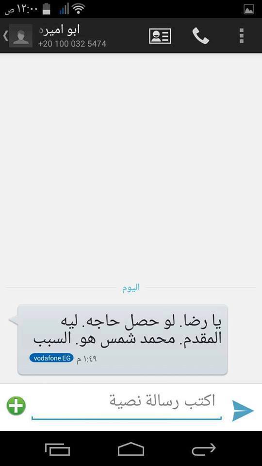 وأكد أنه تلقي رسالة من شقيقة قبل وفاتة جاء فيها: “يا رضا أنا لو جرالي حاجة يبقى المقدم شمس هو السبب”، وبعد تلك الرسالة، اتصل بالرقم حتى رد أحد الأشخاص، والذى أكد أن هناك ضابطًا يدعى محمد شمس الشربينى قام بقتل أخيه، مضيفًا أنهم وجدوا أثر لطلق ناري في الدماغ عندما ذهبوا لأخذ الجثه من المشرحة.