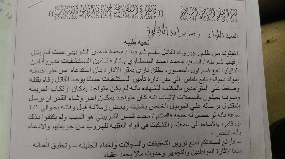 لقي رقيب شرطة يدعى “السعيد محمد أحمد الطنطاوي” مصرعه على يد مقدم الشرطة محمد شمس الشربيني، وفق شهادة شقيق القتيل.