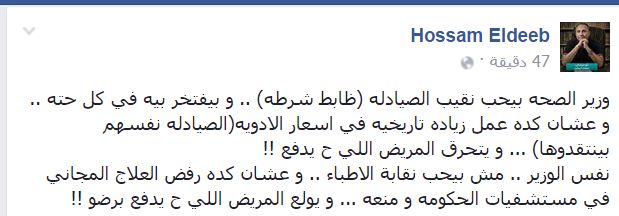 وقال -عبر منشور له على “فيس بوك”-: “وزير الصحة بيحب نقيب الصيادلة (ضابط شرطة).. وبيفتخر بيه في كل حته.. وعشان كده عمل زيادة تاريخية في أسعار الأدوية (الصيادلة نفسهم بينتقدوها).. ويتحرق المريض اللي حيدفع!!“.
