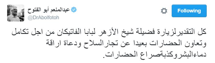 – المرشح الرئاسي الأسبق الدكتور عبدالمنعم أبو الفتوح: كل التقدير لزيارة فضيلة شيخ الأزهر لبابا الفاتيكان من أجل تكامل وتعاون الحضارات بعيدًا عن تجار السلاح ودعاة إراقة دماء البشر وكذبة صراع الحضارات.