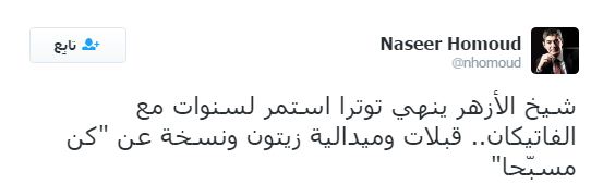 ahmed hussien –: بابا الفاتيكان جالس مكانه وشيخ الأزعر جاء له صاغرًا يطلب العون والغوث فمن يعلو من واليد العليا خير من اليد السفلى.