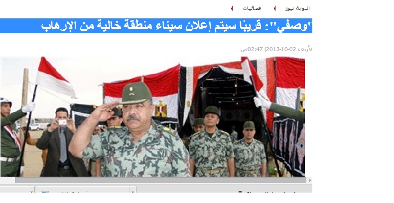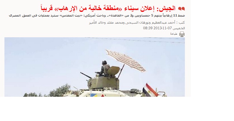 – في 7 سبتمبر 2013م، نشرت صحيفة “الوطن” المحسوبة على النظام مانشيت بعنوان:” الجيش: إعلان سيناء “منطقة خالية من الإرهاب” قريبًا، كشفت خلاله نقلاً عن مصدر عسكري مسؤول، “أن القوات المسلحة ستُعلن سيناء منطقة خالية من الإرهاب قريبًا”، بعد القضاء على أغلب البؤر الموجودة بها، موضحًا “أن الإرهابيين الباقين محاصرون حاليًا في مناطق بجنوب الشيخ زويد والعريش، وأغلبهم من أنصار بيت المقدس”.