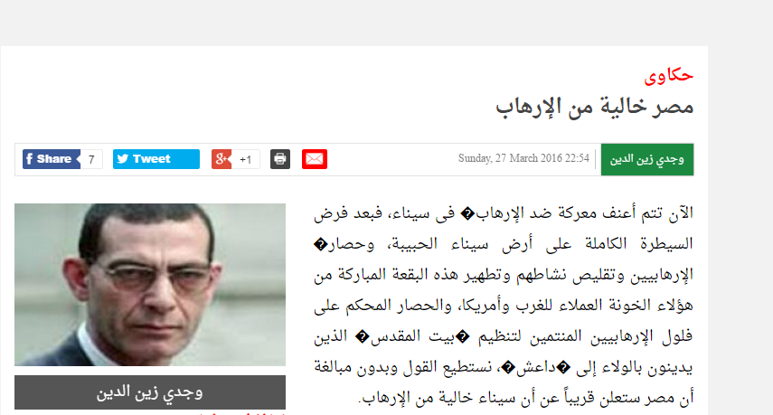 – في مارس الماضي، كتب وجدي زين الدين في صحيفة الوفد تحت عنوان “مصر خالية من الإرهاب”:” الآن تتم أعنف معركة ضد الإرهاب، فبعد فرض السيطرة الكاملة على أرض سيناء الحبيية وحصار الإرهابيين نستطيع أن نقول وبدون مبالغة أن سيناء خالية من الإرهاب”.