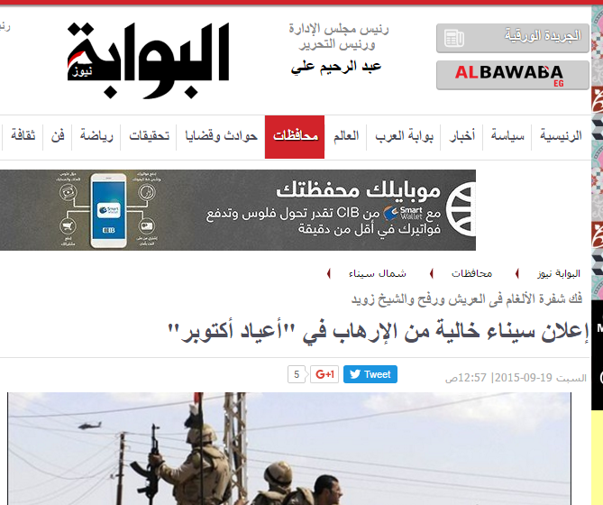 – في أكتوبر2015 نشرت جريدة “الوفد” العديد من التقارير الإخبارية، والموضوعات التي تؤكد أن سيناء خالية من الإرهاب ومن تلك العناوين: “سيناء..انحسار الإرهاب وبدء البناء.. والقادم أقوى”.