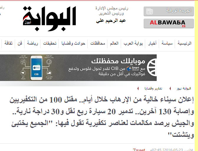 أحدث هذه المانشيتات التي نشرتها صحيفة “البوابة” التي يرأس مجلس إداراتها وتحريرها الصحفي وعضو مجلس النواب عبد الرحيم علي، والتي تعد من الصحف المقربة من الجهات الأمنية، حيث جاء مانشيت الصحيفة بعبارات:”إعلان سيناء خالية من الإرهاب خلال أيام.. مقتل 100 من التكفيريين وإصابة 130 آخرين.. تدمير 20 سيارة ربع نقل و30 دراجة نارية.. والجيش يرصد مكالمات لعناصر تكفيرية تقول فيها: “الجميع يختبئ ويتشتت”.